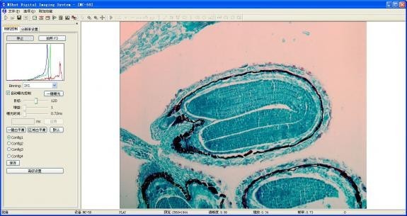 圖4 手動模式下,目標(biāo)按鈕不可用,增益相當(dāng)于ISO感光度,范圍1-1023;曝光時(shí)間比較恐怖,0毫秒到17.9分鐘!一鍵白平衡需要把標(biāo)本移出視野,區(qū)域白平衡比較方便,選擇背景空白的地方做個(gè)選區(qū)即可。點(diǎn)開高級控制,選項(xiàng)不少,增益控制其實(shí)應(yīng)該是手動白平衡。默認(rèn)情況預(yù)覽框里看到的和目鏡內(nèi)看到的相反,習(xí)慣上,我還是勾選上水平翻轉(zhuǎn)和垂直翻轉(zhuǎn)—操作載物臺的習(xí)慣問題。最下方是幀率選擇,默認(rèn)為Normal,還是High來的爽。再回到頂部,點(diǎn)擊分辨率設(shè)置可選預(yù)覽分辨率和照片分辨率,預(yù)覽時(shí)選1280×980可以兼顧分辨率和幀率。如此調(diào)整一番,可見白平衡比較準(zhǔn)確,色彩還原較真實(shí)。下面看圖像說話。