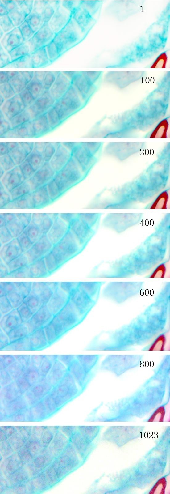 圖10 不同增益下的局部(相對于圖9)對比。在增益800以下,噪點(diǎn)增加不明顯,增益800時(shí),噪點(diǎn)較顯著,最高增益1023時(shí),噪點(diǎn)非常較多,應(yīng)該盡量避免使用。