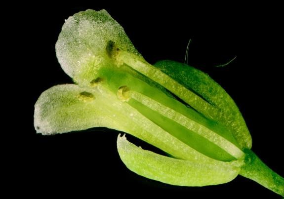 圖14 擬南芥花,4×,某突變體,故花瓣不是純白色,而是有點(diǎn)嫩黃色。整體表現(xiàn)比較到位,但是注意,右上側(cè)的兩根表皮毛顯出綠色,真實(shí)應(yīng)該是無色的。