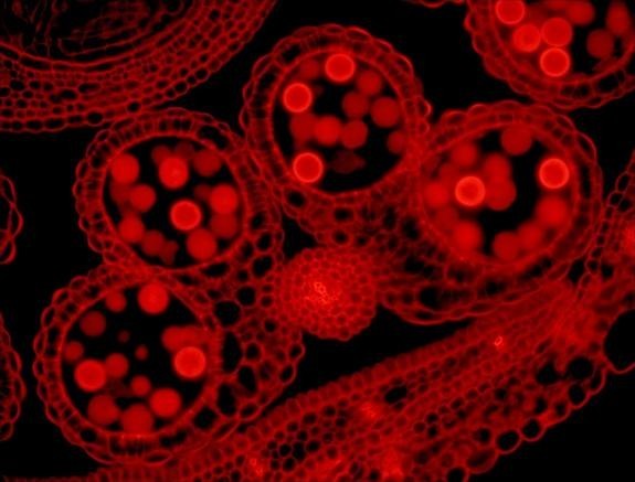 圖15 擬南芥花藥,40×,增益400,127 ms曝光,半薄切片,紅色熒光觀察,有壓縮。背景噪音基本被抑制,細(xì)胞壁成像清晰,色彩較真實(shí)。
