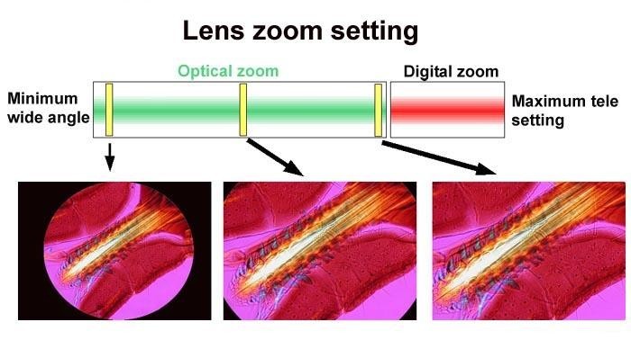 所有的卡片機(jī),顯微圖像必須在相機(jī)設(shè)置為高變焦的情況下拍攝,換言之在遠(yuǎn)程設(shè)置,在數(shù)碼變焦模式極端例子中。高變焦設(shè)置,圖像面也會(huì)變得更小。通常圖片的表面積是目鏡視場(chǎng)的25%-40%。