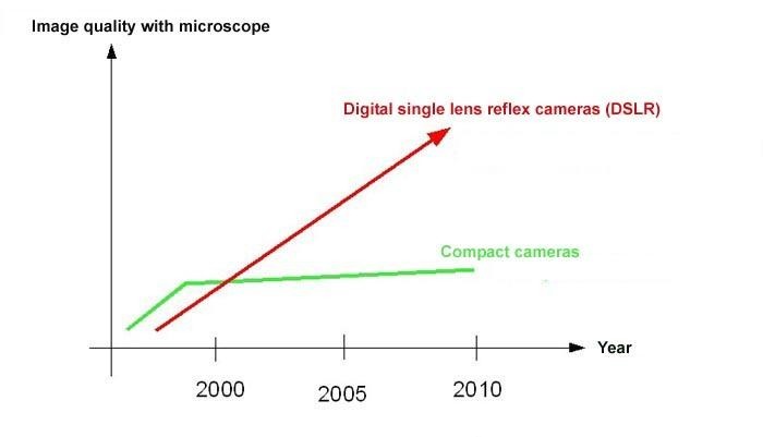 相機(jī)價(jià)格一直在下調(diào),尤其是卡片相機(jī)。那些新的高性能技術(shù)帶來的圖像質(zhì)量的提高大部分都是高端單反相機(jī)型號(hào)。新入門型號(hào)相機(jī)價(jià)格在300歐元或者使用2002年后的數(shù)碼單反相機(jī)也是十分適合用于顯微拍攝。
