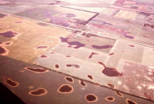 這是1981年從空中拍到的1975年西部馬腦炎病毒爆發(fā)期間紅河區(qū)北達(dá)科塔的草原洞坑濕地的圖片。圣路易斯腦炎爆發(fā)于此。